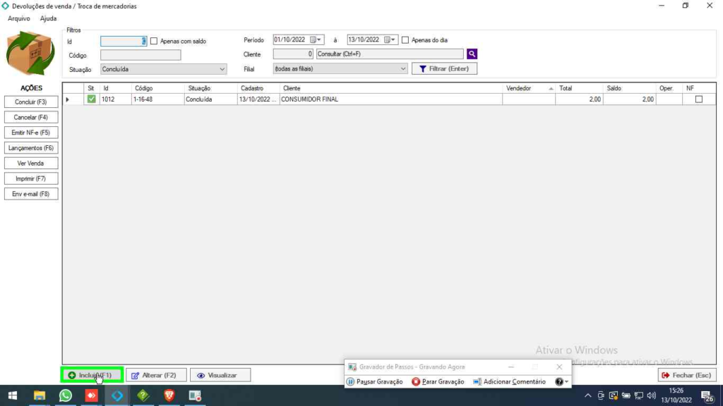 Passo 3: Logo abaixo da tela clique no botão “Incluir (F1)”.