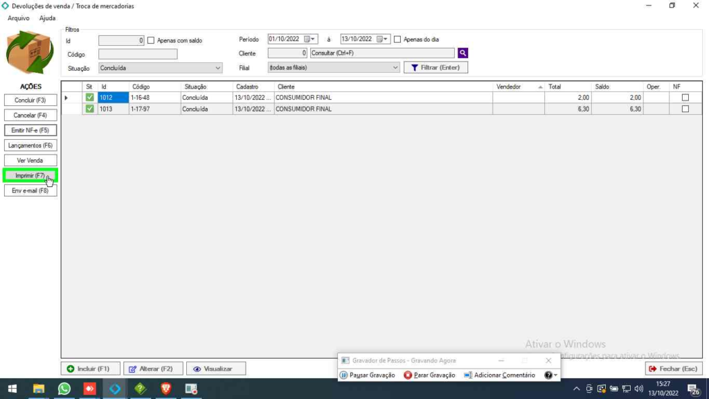 Passo 6: Você também pode imprimir um comprovante para entregar ao seu cliente, assim na próxima vez que ele for comprar é só apresentar o comprovante para o caixa que será usado como abatimento no recebimento da venda. Só clicar no botão “Imprimir (F7)”.