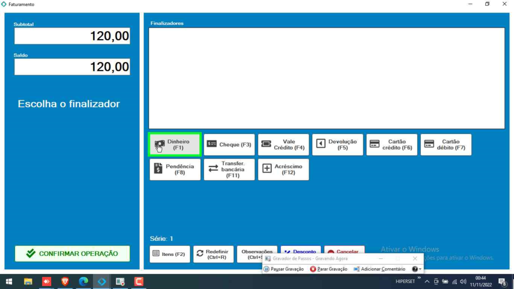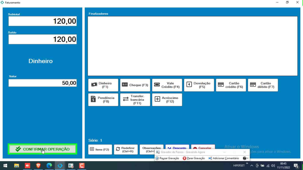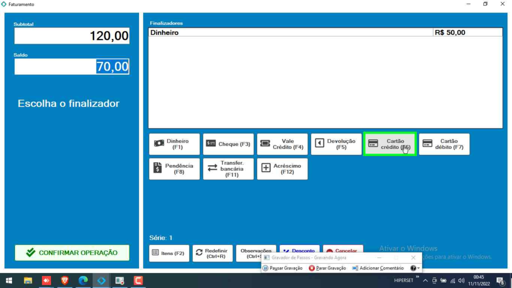 Neste exemplo da venda de R$ 120,00, vamos recebe R$ 50,00 no dinheiro e o restante de R$ 70,00 no cartão de crédito.